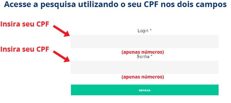 Acesse o formulário pela imagem acima ou clique neste link e responda ao questionário. Para entrar na página com as perguntas, preencha os campos de login e senha com o seu CPF. Em ambos os espaços, insira apenas números do CPF, sem pontuação ou caracteres especiais.