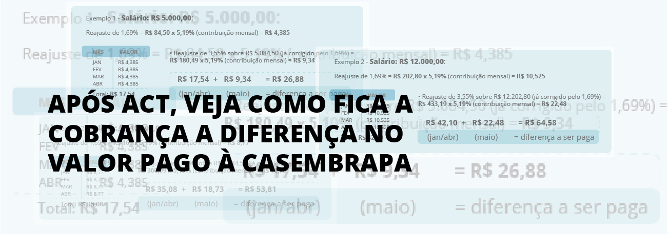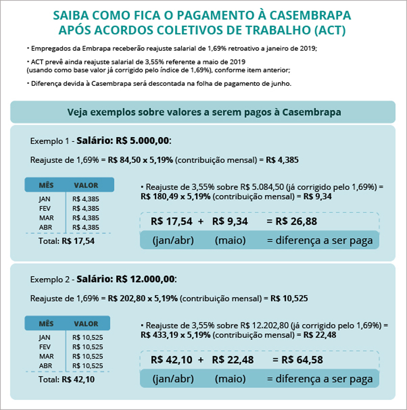 Após a assinatura de dois Acordos Coletivos de Trabalho (ACT), os empregados da Embrapa receberão na folha de pagamento de junho de 2019 um reajuste salarial acrescido dos valores retroativos ao período de janeiro a maio de 2019. O valor será creditado na conta dos funcionários em julho deste ano. Como essa quantia a mais não esteve na base de cálculo para a contribuição mensal à Casembrapa nos cinco primeiros meses do ano, a diferença de valores devida à operadora será cobrada também em junho, sendo debitada do salário recebido em julho, junto com a mensalidade do mês.