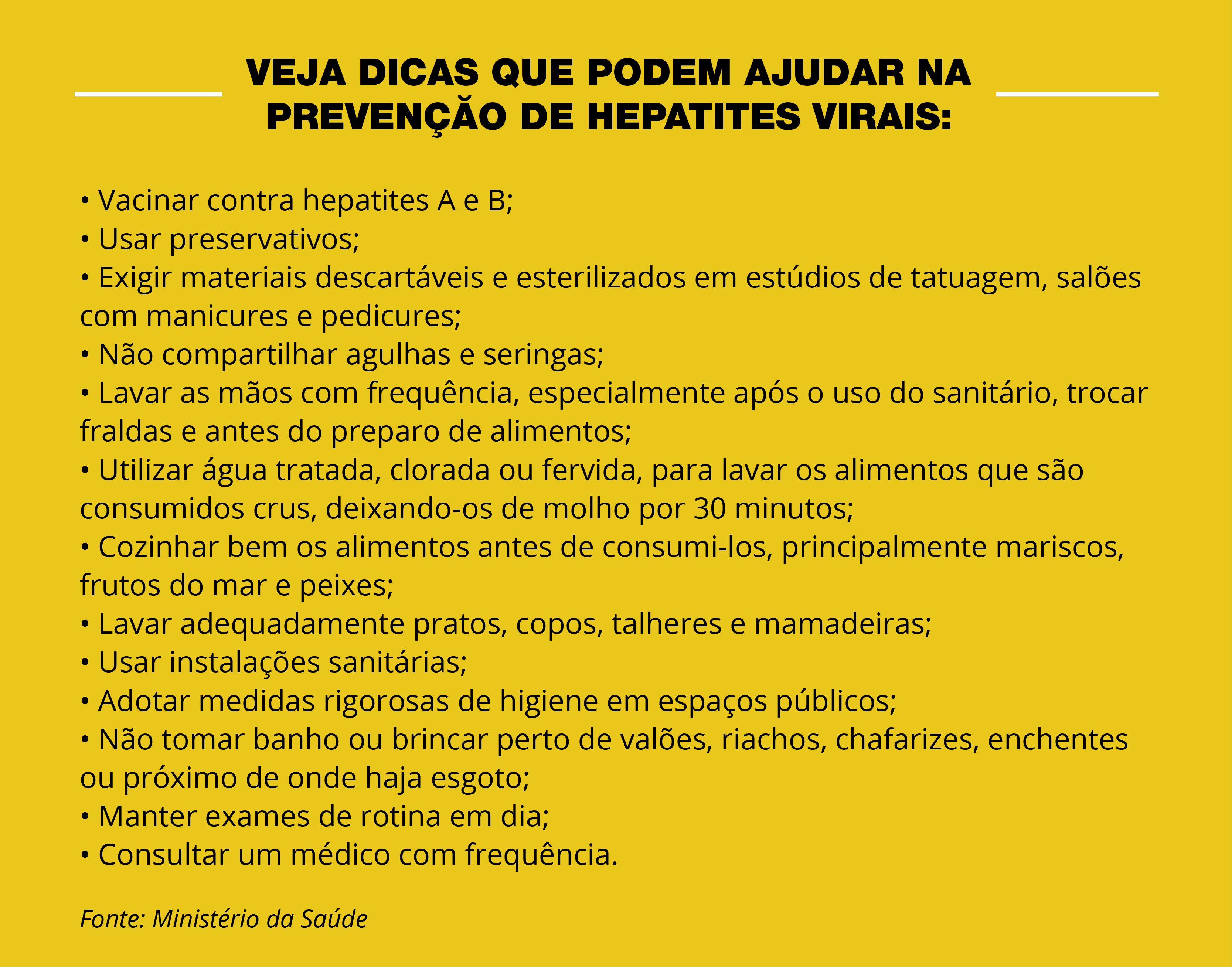A vacina é uma forma de prevenção contra as hepatites do tipo A e B. Quem se imuniza para o tipo B se protege também para o tipo D. Não existe vacina contra hepatite C, mas há tratamento com índice de cura superior a 90%.
