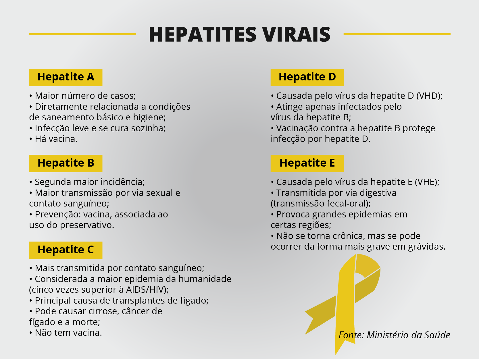A hepatite é uma grave inflamação do fígado que pode ter diversas causas. A doença causa a destruição das células do fígado, com diversas consequências ao organismo. A fim de alertar para a prevenção das hepatites virais, a campanha “Julho Amarelo” busca chamar atenção para os diversos tipos deste mal, que é uma das principais causas de câncer de fígado.