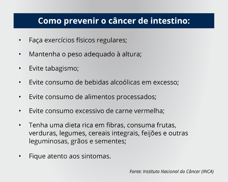 Manter bons hábitos de vida é sempre uma dica para prevenir tumores, especialmente para pessoas com casos de câncer na família. A prática regular de exercícios físicos, a manutenção de um peso adequado à altura, evitar o tabagismo e o consumo excessivo de bebidas alcoólicas e uma alimentação balanceada são fundamentais. No caso da prevenção ao câncer de intestino, a dieta é ainda mais importante, dizem os especialistas.