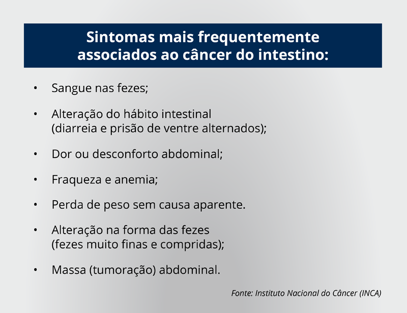 Os principais sinais são sangue nas fezes, alteração do hábito intestinal (diarreia e prisão de ventre alternados), dor ou desconforto abdominal, fraqueza e anemia, perda de peso sem causa aparente, alteração no formato habitual das fezes e massa (tumoração) abdominal.
