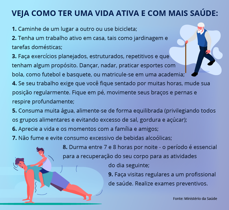 Segundo o Ministério da Saúde, a prática regular de atividade física auxilia na prevenção de doenças como as cardiovasculares, diabetes e diversos tipos de câncer, entre outras, e ainda auxilia na manutenção do peso. O hábito também proporciona a sensação de bem-estar e pode ser um aliado na prevenção da ansiedade e da depressão.