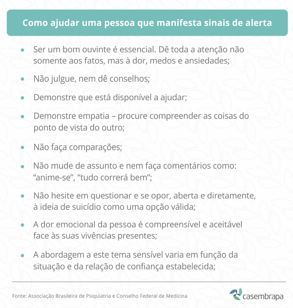 Saber ouvir uma pessoa que apresente os sinais de alerta e também saber aquilo que se deve ou não falar são medidas preventivas importantes. Quem conversa com um paciente deste tipo precisa tentar convencê-lo de que está ali para ajudar e para auxiliar na busca por uma saída.