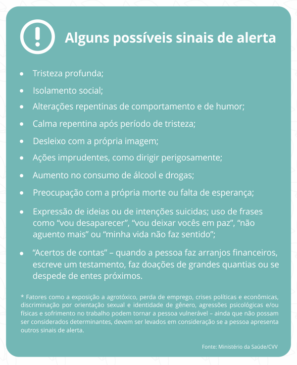 As campanhas atentam para a importância de se saber reconhecer os “sinais de alerta”, em si mesmo ou em alguém próximo (veja abaixo alguns exemplos desses sinais). Esses indicativos são apresentados na maioria dos casos, segundo os especialistas.