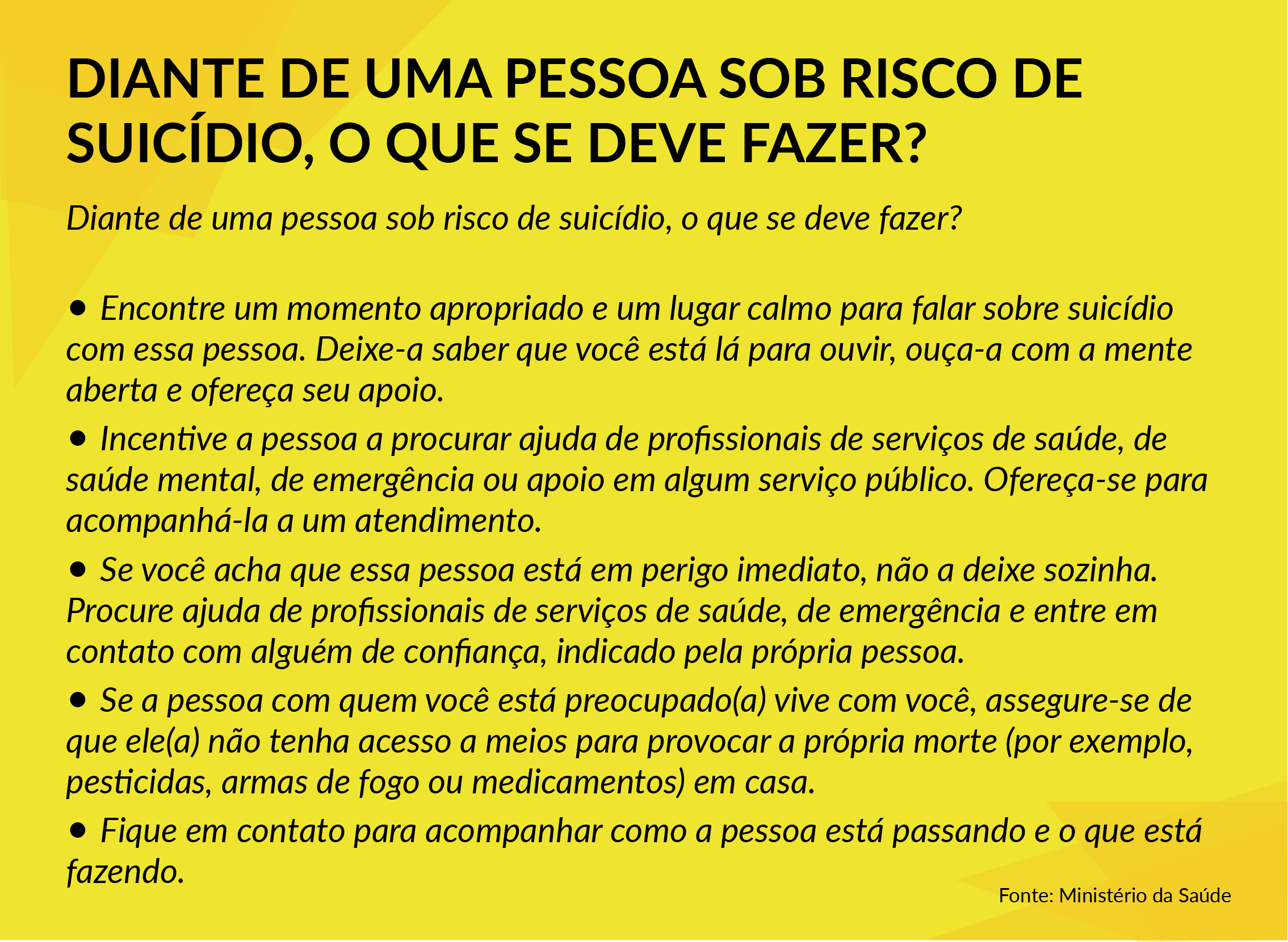 Para conscientizar a população e os profissionais de saúde a reconhecerem os sinais de risco para o suicídio, é realizada durante todo este mês a campanha “Setembro Amarelo”. O intuito é chamar a atenção e orientar sobre o que fazer em prol da luta pela vida.