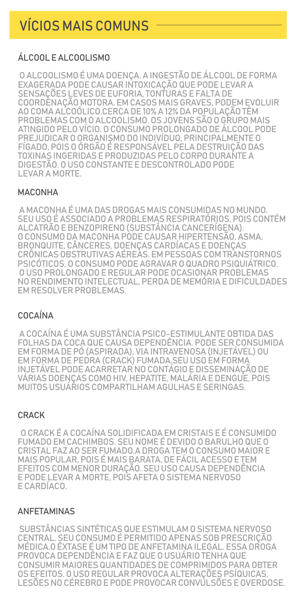 A Organização Mundial da Saúde (OMS) considera doença a dependência de drogas e o alcoolismo, por isso indica a necessidade de ações de prevenção. O problema afeta pessoas do mundo inteiro, atingindo até bebês.